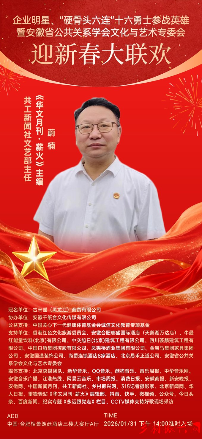 1月31日,由安徽省公共關系學會文化藝術專委會聯合“企業明星”“硬骨頭六連”“16參戰英雄”代表共同舉辦的“迎新春大聯歡”活動,将在合肥溫情啓幕。共工新聞社文藝部主任、《華文月刊》“薪火”特刊主編蔚楠應邀作爲特邀嘉賓出席,與軍旅英模、企業代表及文化界人士共聚一堂,共話文化傳承、共叙家國情懷,爲這場融合紅色精神、企業活力與藝術魅力的新春盛會注入深厚的人文溫度。